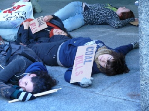 On November 16th, SDSers had a ‘cough-in’ and ‘die-in’ from the terrible fumes coming from Bank of America, as part of Rainforest Action Network’s ‘Nationwide Day of Action’ against new Coal-fired power plants and destructive mining practices such as Mountaintop Removal. more pics below…