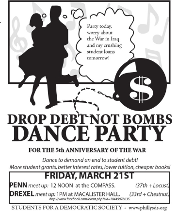 FUNK THE WAR with Philadelphia Students for a Democratic Society on March 21st as we dance through Penn and Drexel Universities to demand an end to war and student debt! We are celebrating the launch of our Drexel and Penn chapters with a sonic boom for the 5th anniversary of the War in Iraq. Across the nation, Students for a Democratic Society is holding walk outs, nonviolent actions for student power, peace, and affordable education.